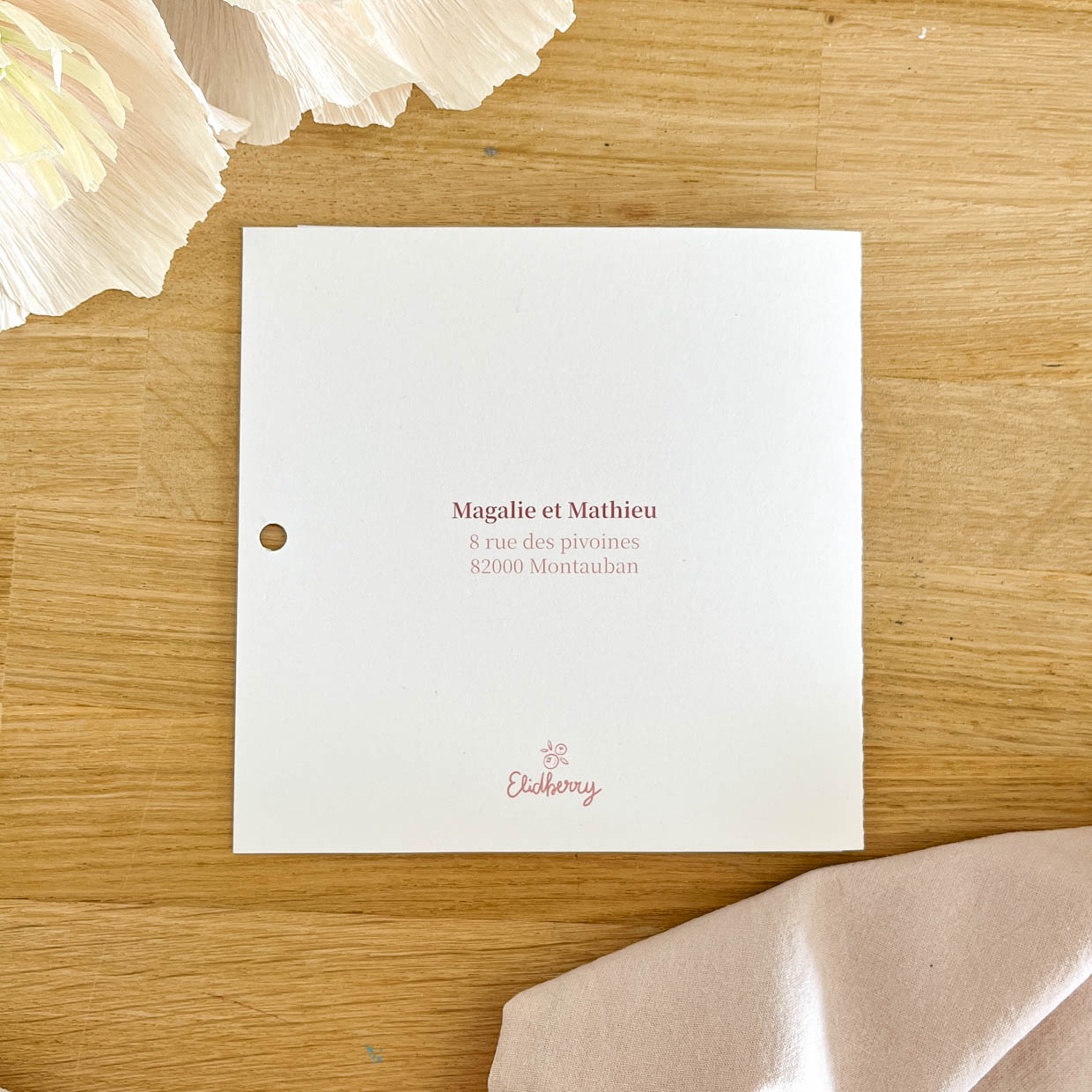 Faire-part fille Emma, carte pliée 13,5 × 13,5 cm avec son enveloppe.